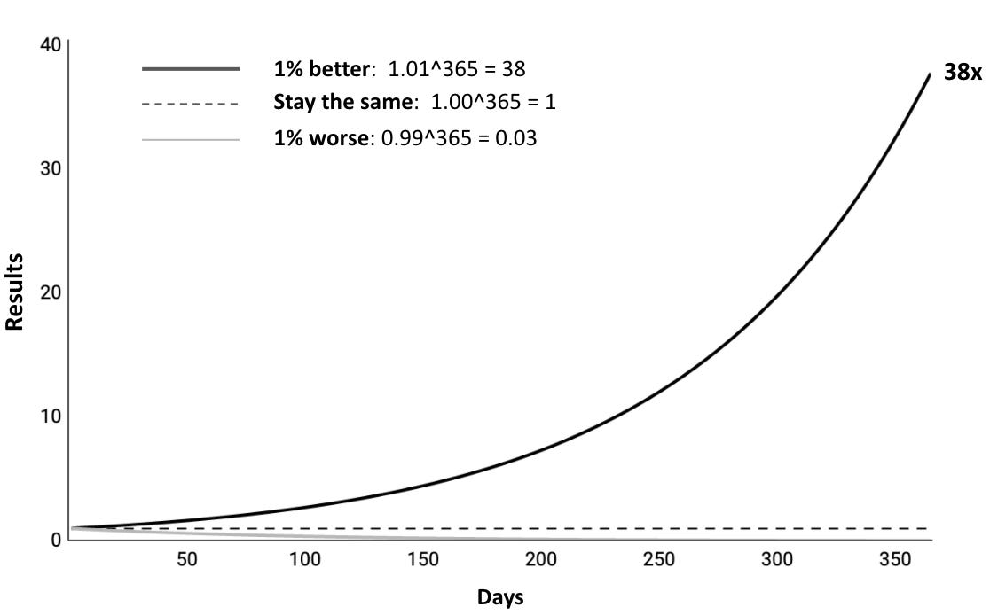 In short, if you get 1% better at something each day - over one year, you will become 38 times better at it. If you stay the same, you're still at 1, and if you get 1% worse… well, you get the picture.
